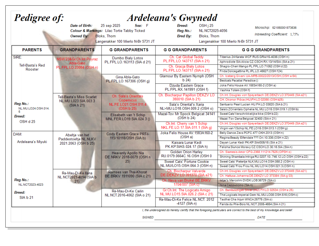 Ardeleana’s Gwynedd Ardeleana's Gwynedd (midden) als kitten van een paar weken oud Geboren op 25 september 2025. Ze is een Lilac Tortie Tabby Ticked (OSH j 25)